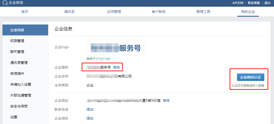 01.企业管理员在企业微信管理后台-我的企业-企业信息中找到企业简称对其进行编辑及认证。