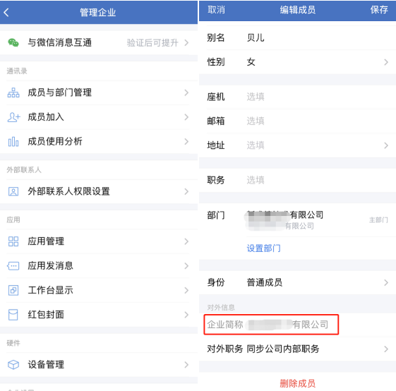 企业微信管理员可在PC端后台和手机端的通讯录中进行配置,例如常用的手机端在工作台-管理企业-成员与部门管理中为不同部门成员设置不同的对外简称;例如客服部设置为企业品牌服务号、销售部简称为企业品牌名称等。
