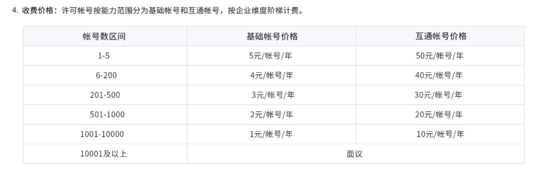 看了上图收费价格,大家的第一反应是什么是互通账号,为啥互通账号的收费是基础账号的10倍,谁给了腾讯这个勇气,难道腾讯不怕钉钉和飞书来抢客户吗?