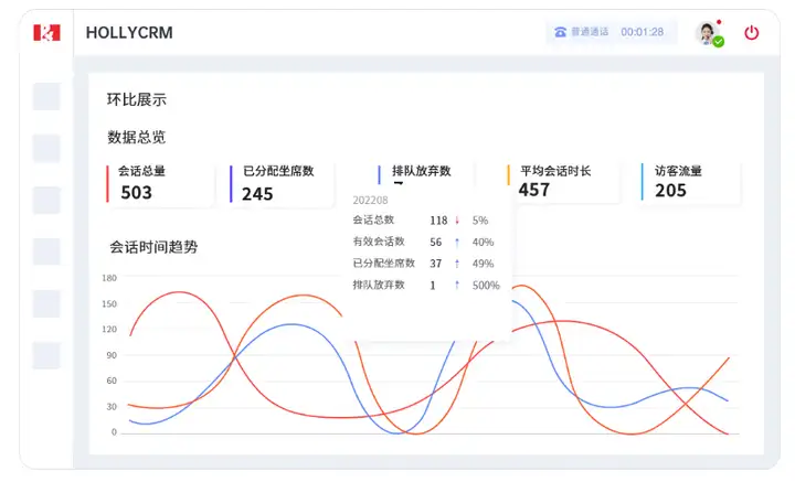 为助力企业数据管理更高效、更科技智能,合力亿捷除了过往对坐席会话数量、排队放弃数、机器人服务数等多维数据进行统计展示,同时新设环比数据展示,更加便于管理者就数据变化趋势快速进行数据分析,从而开展相应的服务团队管理调整。