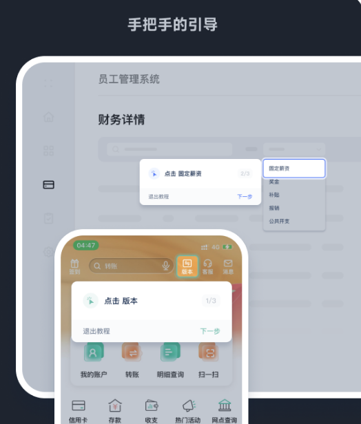 根据用户设定的逻辑,例如初次访问,域名,新功能发布等逻辑触发软件界面上层的交互式用户引导。支持Web端,移动APP端,小程序端,桌面端解决方案。