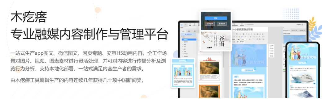木疙瘩是一个专业融媒内容制作与管理平台,提供了图文、H5、图片、视频、数据图表等完整的内容创作工具套件,并可对内容进行流量分析、传播分析及浏览行为分析,支持本地化部署,一站式满足内容生产者的需求。