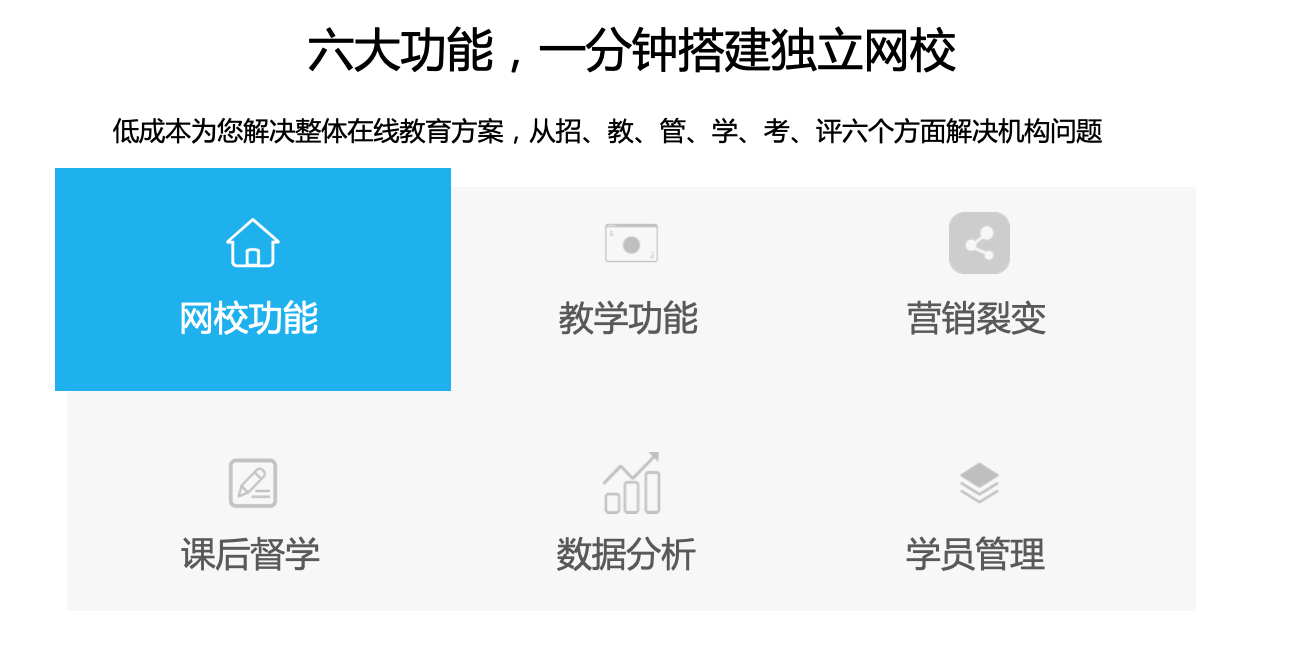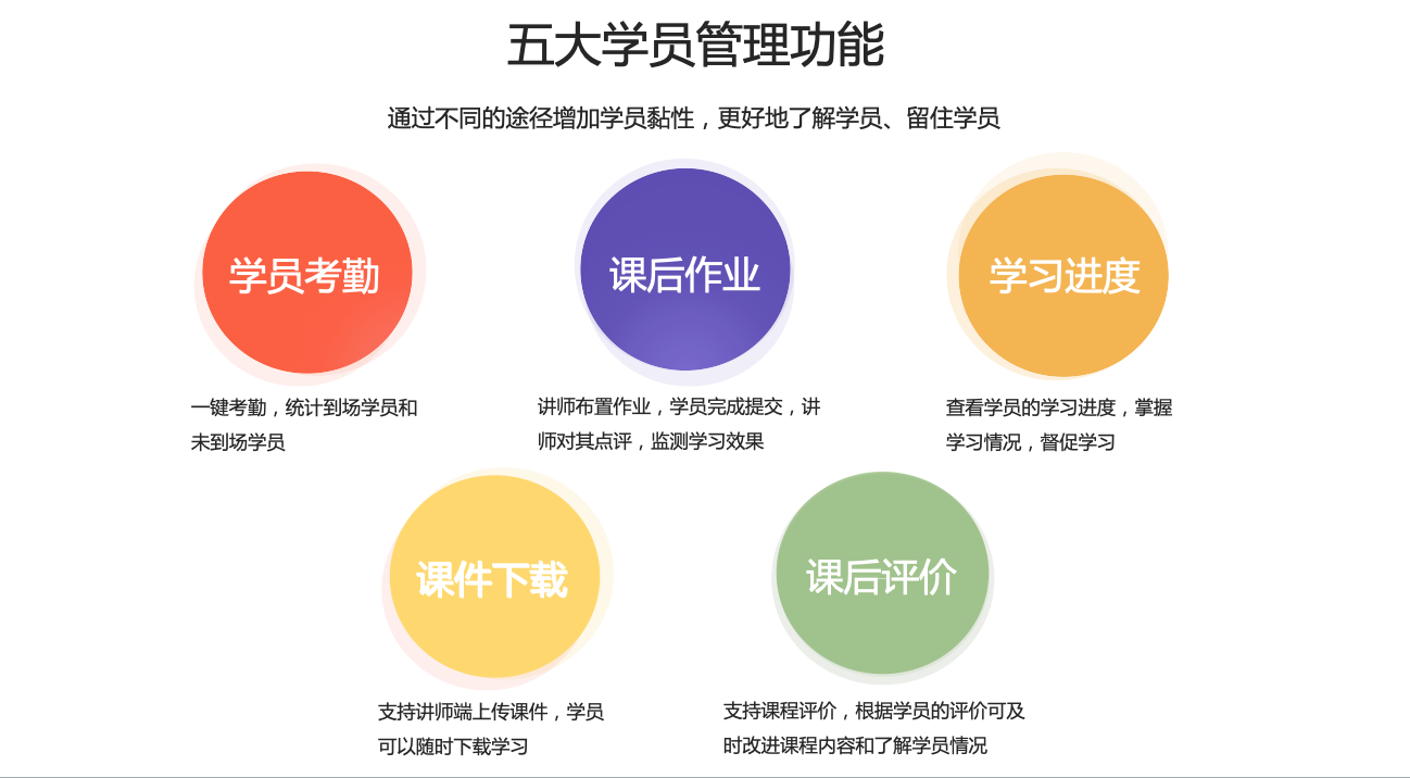 【微开讲】其13种教学方式,140多种功能,从招、教、管、学、考、评六个方面出发,解决教育机构本质问题;围绕着预售裂变招生、多元化直播授课、互动答疑、学员管理和数据分析、课后练习和评析、小班面授讲解等六个体系,帮助教育培训机构实现快速增长裂变!