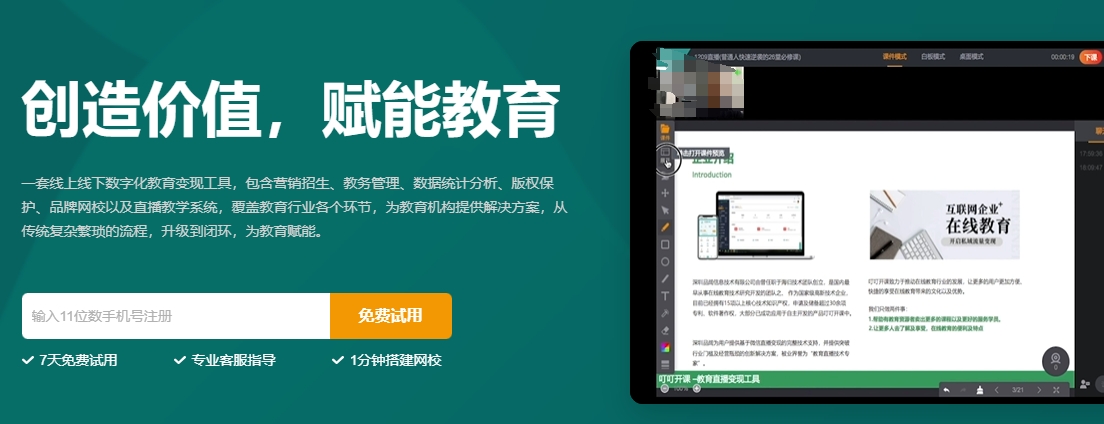 叮叮开课是一套线上线下数字化教育变现工具,包含营销招生、教务管理、数据统计分析、版权保护、品牌网校以及直播教学系统,覆盖教育行业各个环节,为教育机构提供解决方案,从传统复杂繁琐的流程,升级到闭环,为教育赋能。