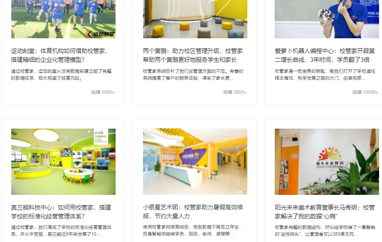 校管家深耕教育行业多年,不断积累经验,主要合作客户有运动刻堂、两个黄鹂、爱萝卜机器、奥兰熊科技中心、小银星艺术团、阳光未来美术教育等案例,以下只是截取了部分案例。
