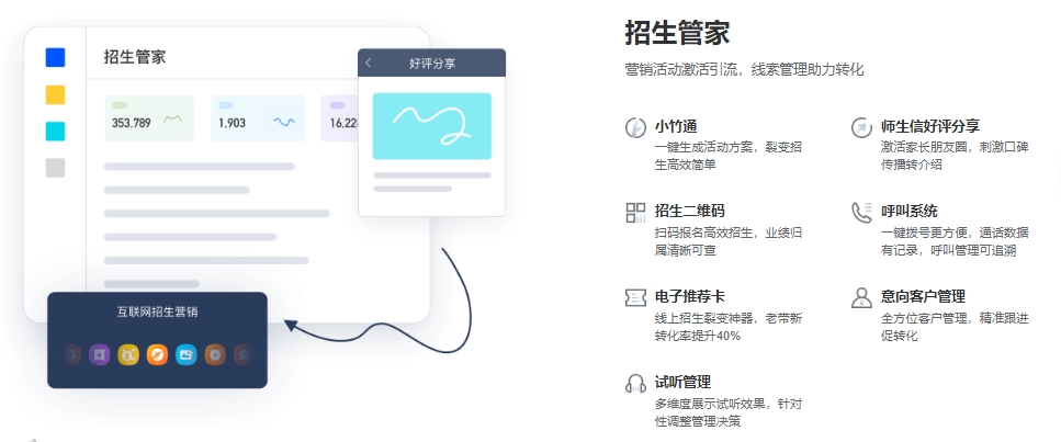 这个牌子的系统,还有很多万人大校,用了几年、十几年了,系统的功能、对于培训机构的适配性,都已经磨得非常好了,确实能够很好地帮我们学习提高管理效率和教学质量。比如,可以用校管家定时推送学员上课及考勤情况,家长随时随地了解学生的学习动态;此外,校管家云校教培软件还提供学员评价体系和学员成长记录,让家长了解学生在校真实学习情况。另外,通过校管家云校教培软件,机构可以开展多种形式的学员活动,大型品牌活动提升学校形象。