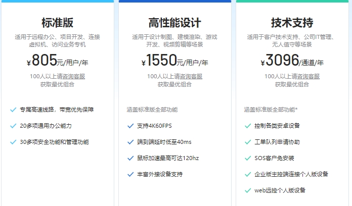 标准版:805元/用户/年,适用于远程办公、项目开发、连接,虚拟机、访问业务专机