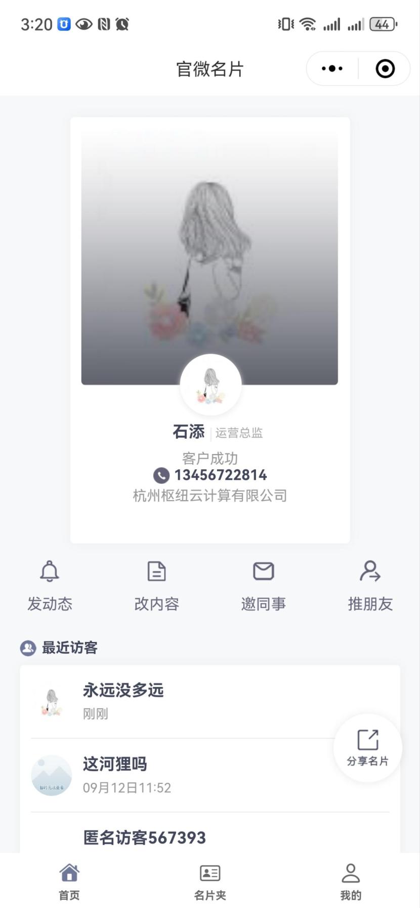 你还在麻烦公司的设计师和同事帮你做电子名片吗?事实上,制作电子名片并不难。你只需要使用好的软件就可以制作高大的电子名片,并且有自己的特点。 目前我最常用的电子名片形式就是微信小程序了,那就用官微名片微信小程序讲解下怎么制作电子名片。 1. 先在微信搜索 “官微名片”, 找到小程序点击进入 2. 点击 免费创建我的官微名片, 然后输入姓名 手机 公司 职位 这样一张简单的电子名片就生成了。 当然如果你已经有纸质的名片,你也可以通过点击“名片设计制作软件”这个微信小程序让软件自己识别纸质名片,生成你的电子名片。 |