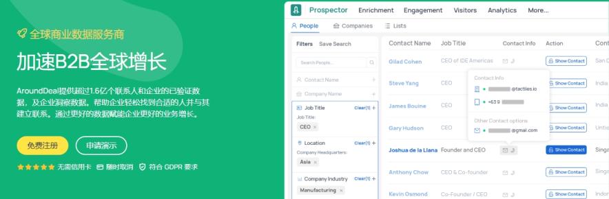 AroundDeal是一家全球商业数据服务商,提供超过1.6亿个联系人和企业的已验证数据及企业洞察数据。它致力于帮助企业轻松找到合适的人并与其建立联系,通过更好的数据赋能企业实现业务增长。