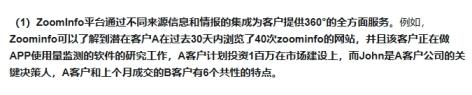 评价:ZoomInfo平台通过不同来源信息和情报的集成为客户提供360°的全方面服务。例如,Zoominfo可以了解到潜在客户A在过去30天内浏览了40次zoominfo的网站,并且该客户正在做APP使用量监测的软件的研究工作,A客户计划投资1百万在市场建设上,而John是A客户公司的关键决策人,A客户和上个月成交的B客户有6个共性的特点。