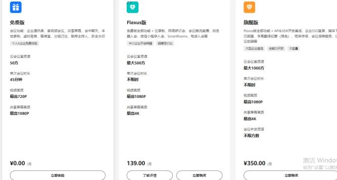 2、Flexus版:中小企业/组织内部会议、远程办公、培训、涉外沟通,简单易用、稳定可靠,139.00元/月。