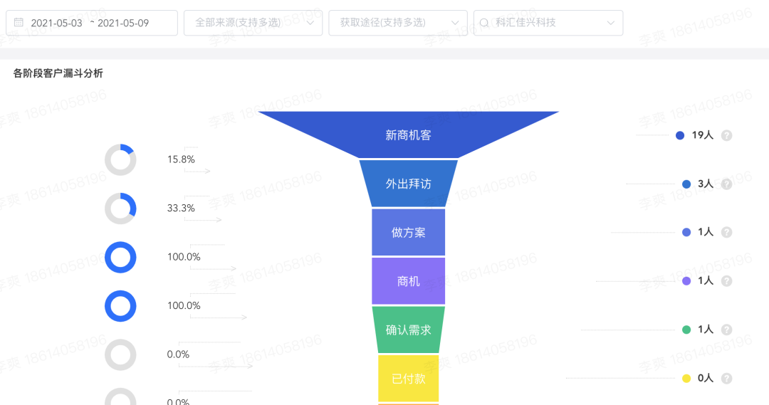 通过「转化漏斗」,可以透视不同转化环节的管理盲区,还能筛选来源、途径,及时发现销售过程中遇到的障碍,促进商机转化,提高效率。