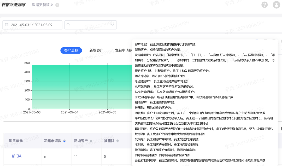 主管可以随时导出「微信跟进洞察」中的数据,查看客户数量增加情况,如客户总数、总跟进客户数、总有效沟通数等,分析销售情况。同时,通过建立销售转化漏斗,找到影响转化的关键环节,想办法再优化,提升转化效率。
