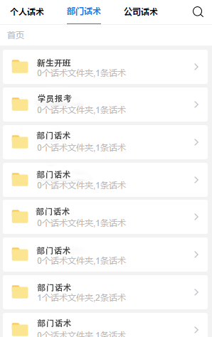 主管可以收集新生开班、培训报考等话术,上传到部门话术中,提供老师使用。这样,面对来自天南海北的学员的不同表达方式,老师可以通过「话术」快速定位问题并发送给学员。