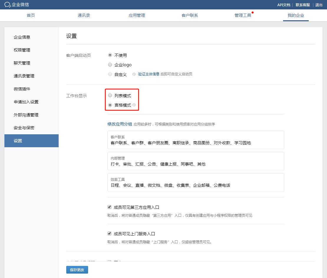 其实这个问题大多数是因为工作台的显示方式的原因,一个是列表模式,一个是宫格模式;管理员可以登录管理后台—我的企业—设置—工作台显示中进行添加/编辑分组,操作后需点击保存按钮;