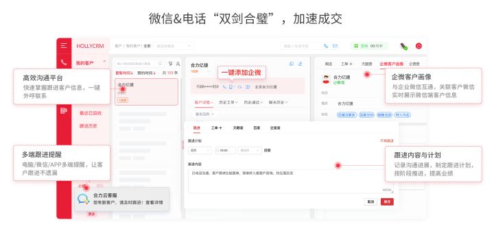 在电销模式面临挑战与难题的今天,合力亿捷将电话与企业微信双融合,以优势互补的模式,率先提出了“电话&微信双剑合璧”的概念,从降低获客成本、提升成交转化率、减少客户资源流失等方面,助力企业进一步降本增效,提升企业效益。
