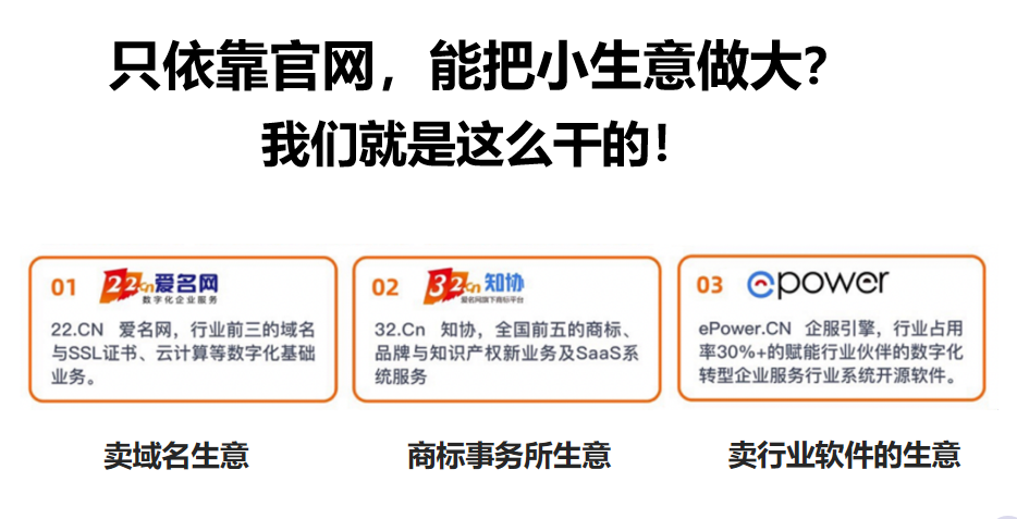 08年之后,我们公司就从原来的业务中选出来几个来做到极致,通过自己官网运营,做了爱名网(22.cn)的域名,知协(32.cn)的商标、知识产权生意,epower(ePower.cn)卖企业服务行业软件生意。