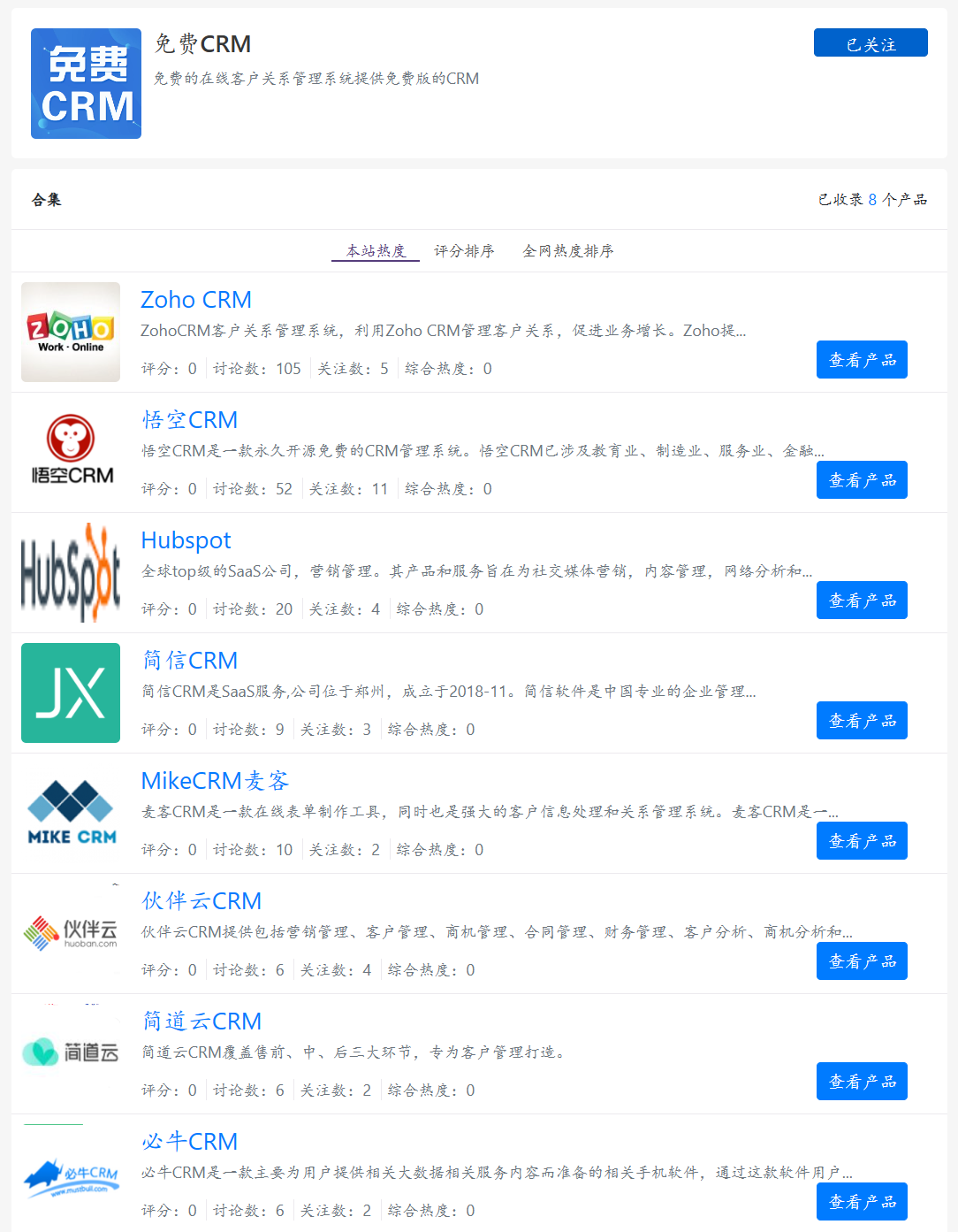 注:以上排序根据产品评分、站内外热度综合计算得出,会不断发生变化,截取日期为2023年7月。排名靠前的有悟空CRM、Zoho CRM、伙伴云CRM、简道云CRM、必牛CRM等。
