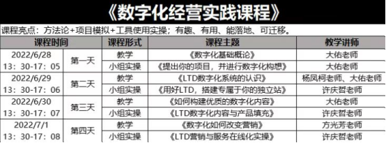 结合《创业实践模拟》课程教学的需要,由杭州电子商务研究院和浙江贰贰网络有限公司提供软件平台技术服务,包括:数字化经营与管理实操教学平台,内含服务课程的LTD数字化经营方法论教材【数字化人才赋能体系、中小商业数字化服务系统设计理论与实践、能落地的ToB内容营销指南(电子和纸质版)】、课程教学材料【教学PPT和相关操作规程】、学习小组(5人/组)数字化系统账号【组长总账号与团队成员分账号】、项目成型后的一键发布与数字化管控系统。以下三个表格为课程教学安排及相关内容、目标、活动安排、课程任课师资和学生成绩数字化评估表: