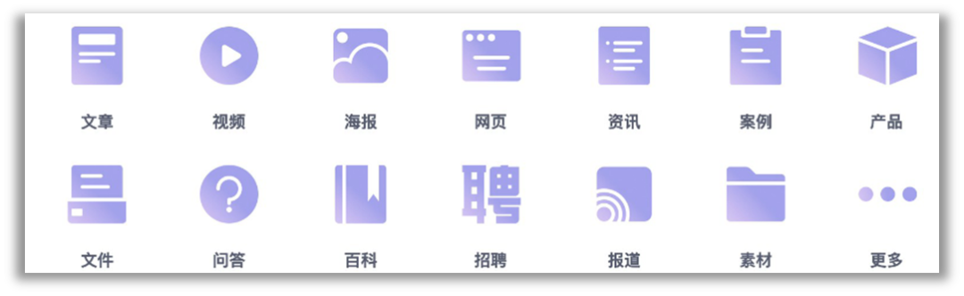 前⾯的章节⾥介绍了利⽤LTD营销SaaS添加⽂章、产品、案例等⼏种常⻅的内容类型。除了这⼏种类型之外,通过 官微中⼼ > 内容 ,还可以进⾏包括短视频vlog、公告通知、常⻅问题、业务知识、招聘信息等其他各种应⽤场景 内容的添加与编辑。