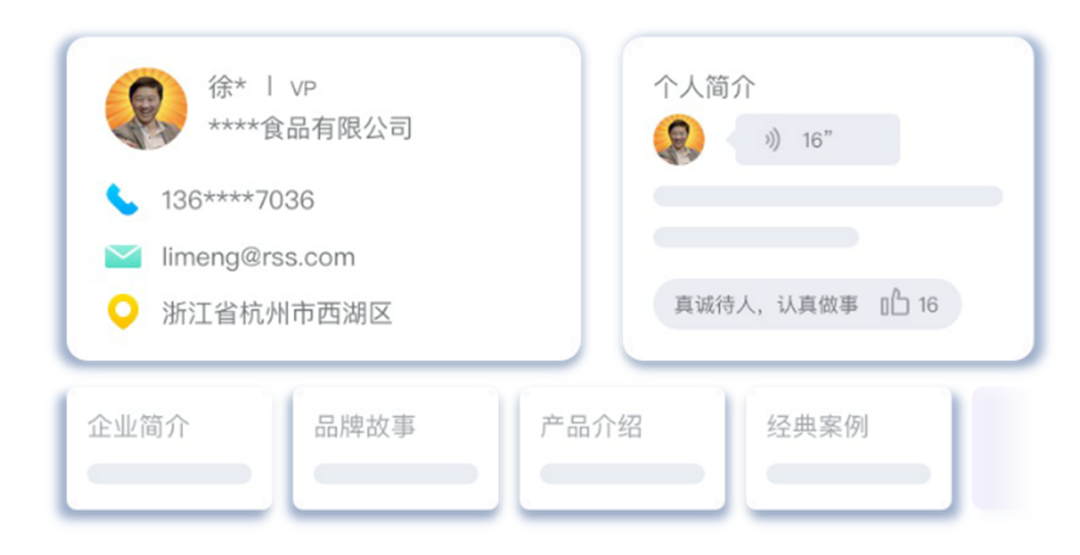 互联⽹时代移动化、智能化的⼤趋势下,我们可以清晰地感受到传统名⽚在内容容量、 展示⽅式以及客户粘性上存在不⾜。基于微信⽣态开发的新⼀代智能社交电⼦名⽚,与企业的官⽹连通,可以分享到社交媒体,任何对名⽚的访问⾏为数据,在后台⼀⽬了然。