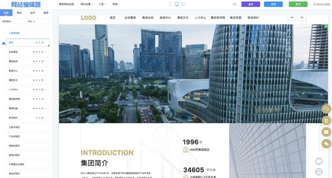 在网站搭建方面,通常数字化官网系统,都以一个拖曳式的可视化编辑器作为网站的搭建工具,所见即所得,配合大量的可用组件和模块,往往规划者自己、甚至是企业的管理人员,就可以完成所有以往需要UI设计师、前端开发工程师才能完成的网站搭建工作。