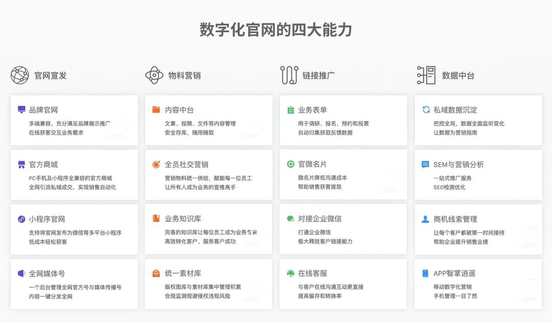 “数字化官网即具备数字化能力的官方独立网站。它通常要具备官宣(官方宣传)、物料(数字内容)、链接(数字渠道)、数据(数据私有)等四大基础数字化能力,以满足“业务在线、用户在线、成员在线,数据归集”的数字化综合运营需求的新型官方网站。