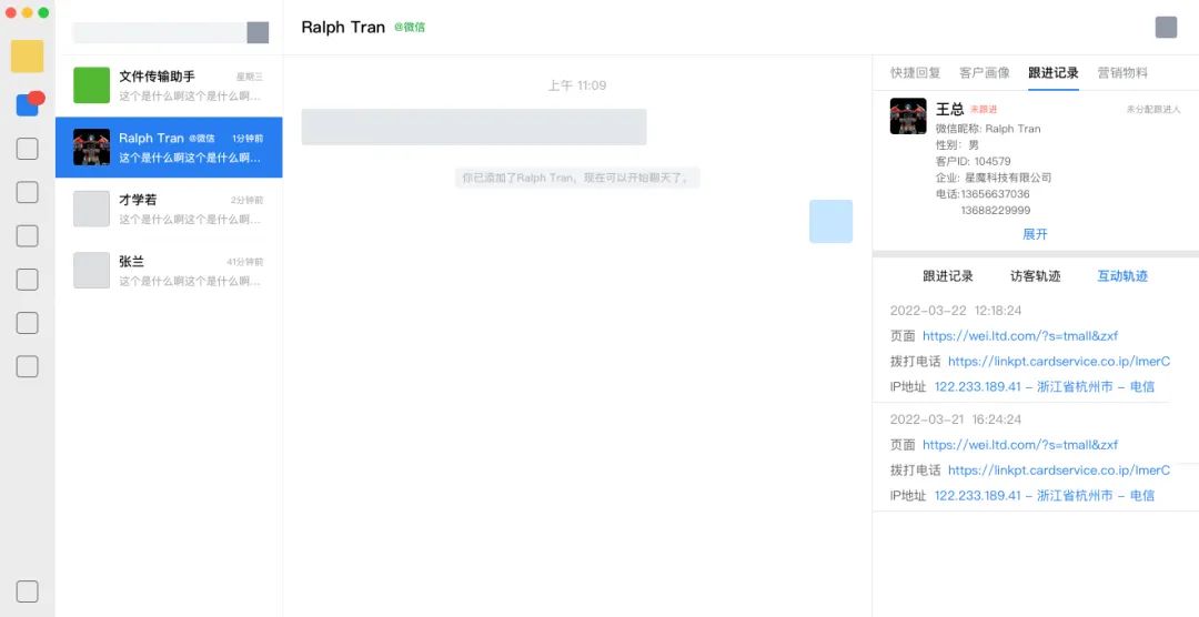 一个典型的应用场景是,通过企业微信链接微信上的一个客户,对接企业微信并在聊天对话框中显示官网后台里的客户数据与官网内容,将官网上的一些营销载体(比如意见收集、投票等等),通过聊天方式发送到客户,而客户在这些营销工具中的行为,再次汇总到官网后台,完善了这个客户的信息。相同的客户在其他渠道的行为、通过类似的链接方式,最终都汇总集中在官网的一个客户身份上。
