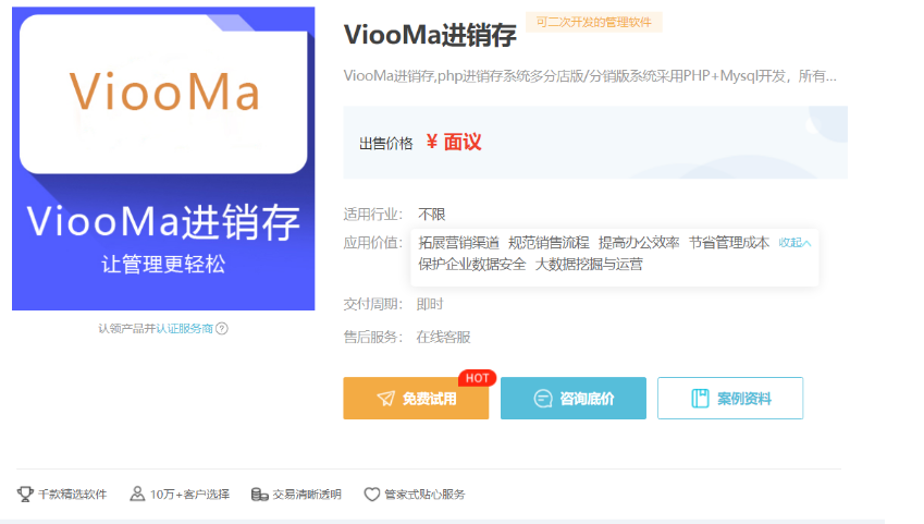 ViooMa进销存是一款基于ThinkPHP+LayUI开发的进销存系统,采用PHP+Mysql开发,所有代码均无加密,方便大家可以进行二次开发,他们也提供相关的技术支持服务,让用户随时随地掌握门店营业情况,客户回头率,营业利润等,帮助用户进行精准营销,ViooMa进销存已经为社会上237个行业的企业和组织提供成熟的解决方案,为企业部署并推广适合于该行业的进销存和小程序。