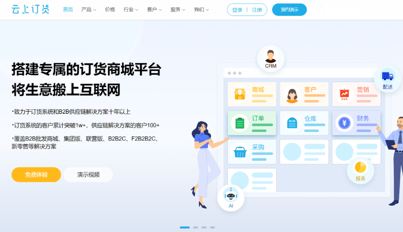 云上订货是为商贸批发、品牌厂商和连锁总部提供搭建专属的B2B订货商城平台,将生意搬上互联网,帮助企业通过订货系统管订单、管商品、管客户、管货款、管营销、管业务员,以订单快速驱动销售、仓库、采购、财务等企业内部环节运转起来。