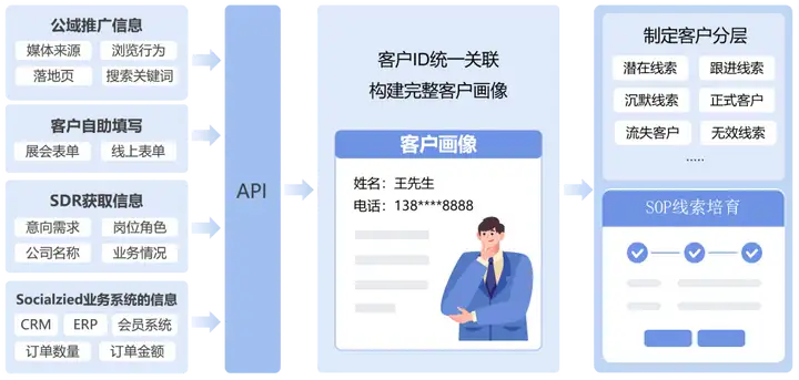 基于线索引流后,客服仅需在一个平台就可实现全渠道客户数据的处理,并借助一键加微等功能辅助,快速引导客户进入私域流量池;同时依靠crm系统与平台数据的互通,抓取历史订单信息、搜索关键词、浏览行为等全量数据进行客户画像完善,让营销行为更具针对性;