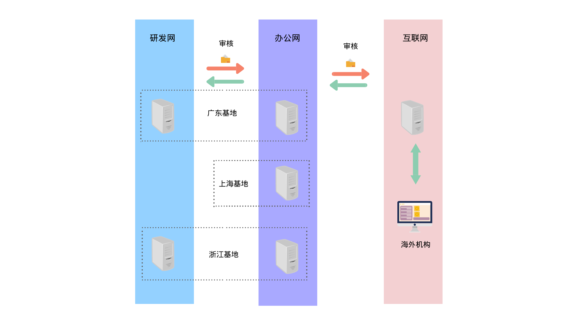 可以做到不同基地同网段内允许自由交换、不同基地不同网段文件受限交换的效果,所有交换始终遵照高密区向低密区发送文件需要通过内部审核的原则。