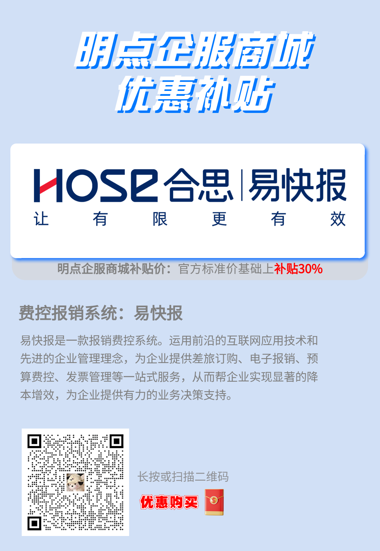 SaaS点评网明点企服商城官方补贴,现购买易快报系统,享受补贴30%。同时还有选型顾问1V1提供选型服务,让你的软件选型更便利、更实惠!
