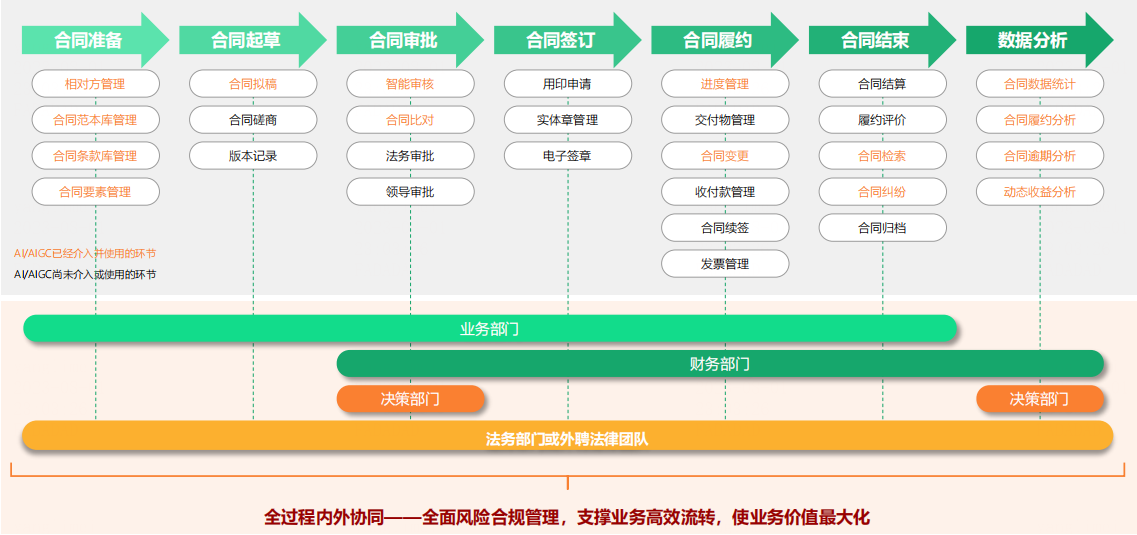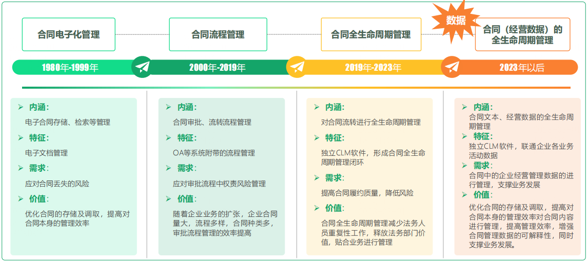 而聚焦国产CLM,从1980年开始,经历了“合同电子化管理”“合同流程管理”以及“合同全生命周期管理”三大阶段后,如今终于走到了“合同(经营数据)的全生命周期管理”阶段,迎来了全新的发展周期,正式进入CLM2.0时代。