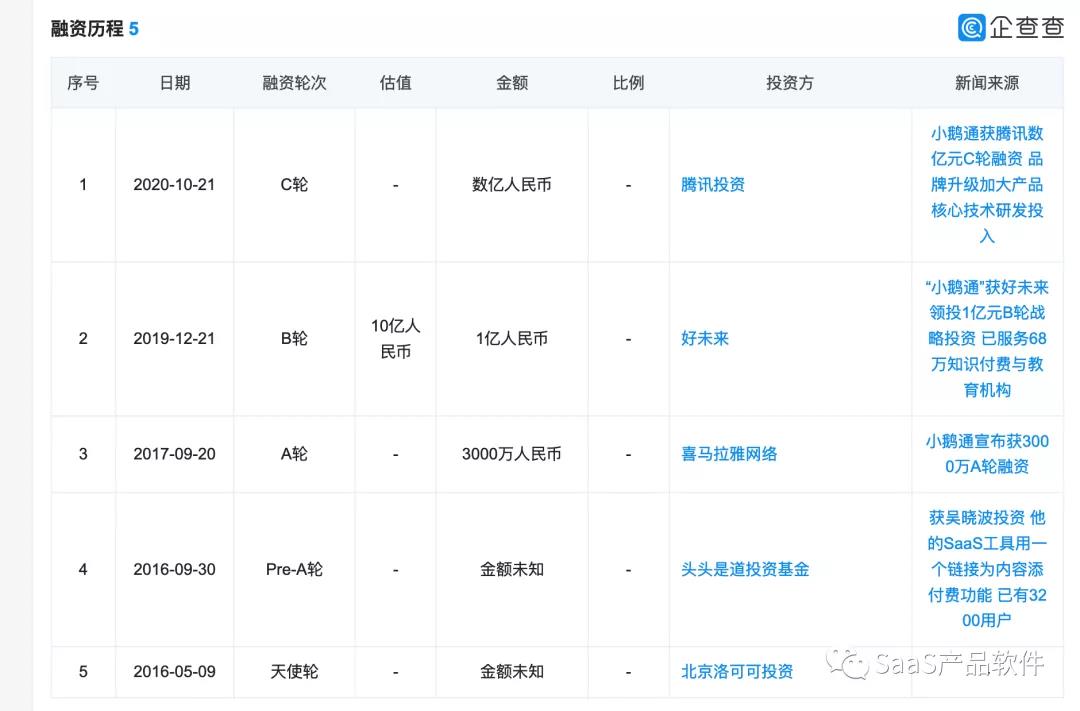 从企查查页面中可以看到,小鹅通目前的融资情况是:C 轮,2020 年十月,得到腾讯领投的C 轮。
