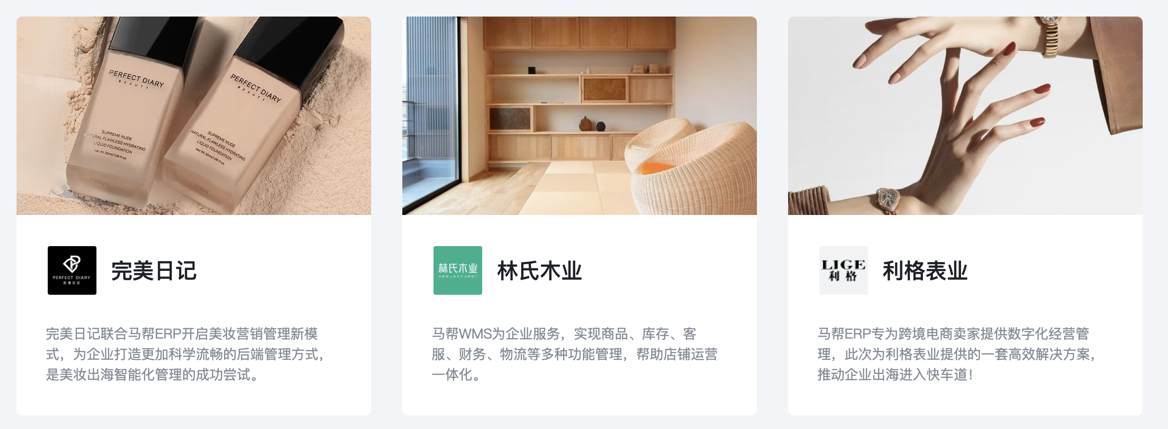 马帮ERP已与完美日记、林氏木业、利格等客户合作,部分客户示例如下图。
