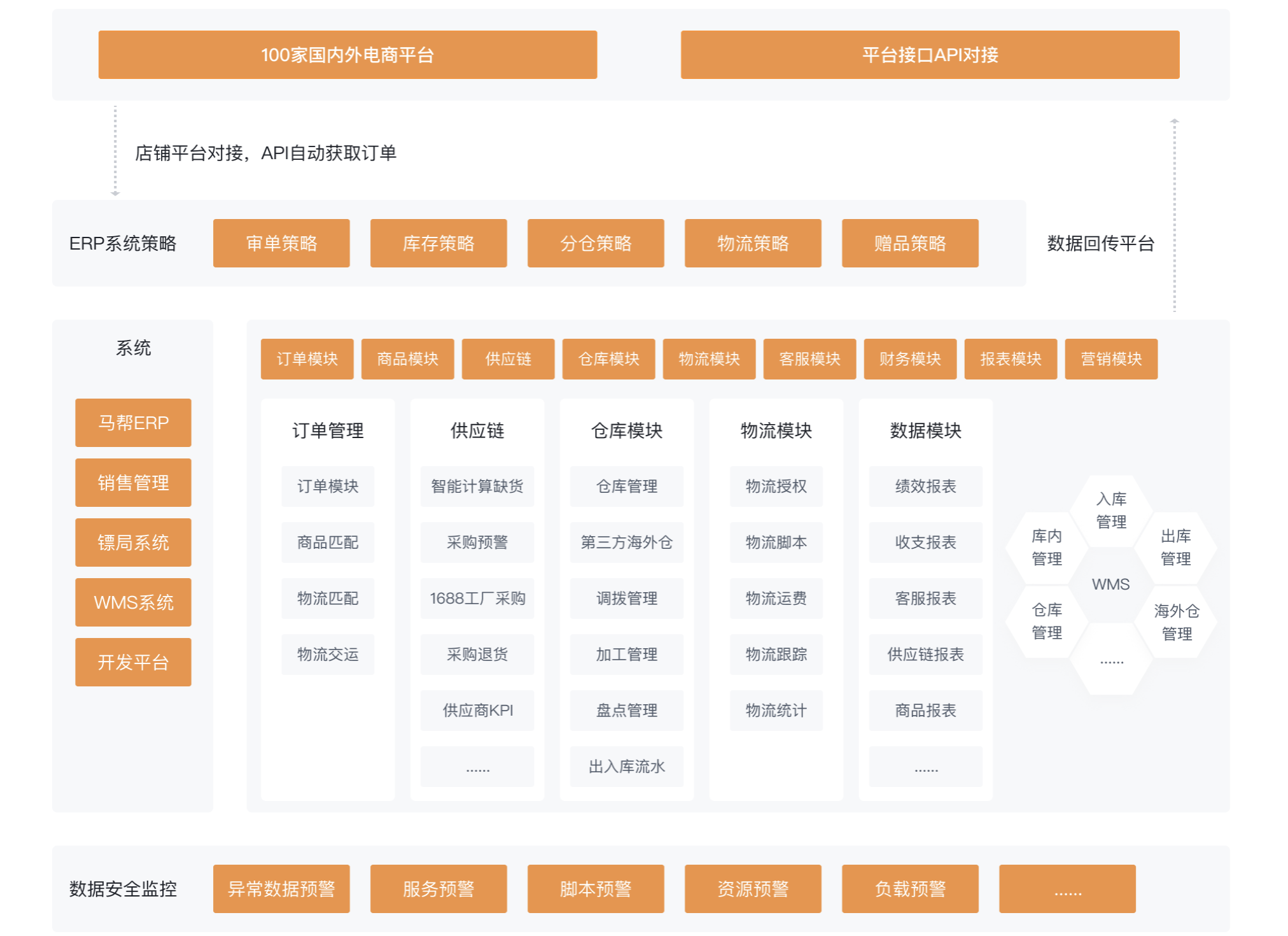 马帮ERP拥有跨境电商专业全流程解决方案,通过选品、刊登、订单处理、商品管理、采购管理、物流管理、客服管理、财务/报表功能,为客户提供精细化解决方案,全流程赋能