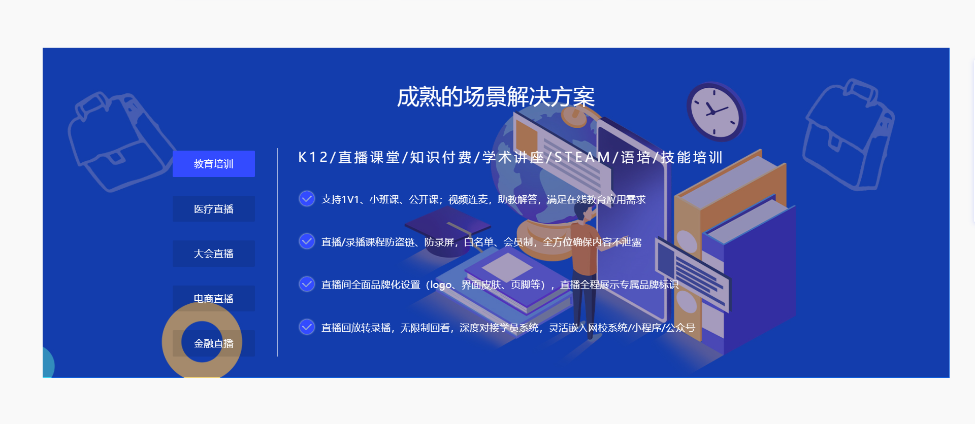 有因直播以客户服务为中心,产品服务主要覆盖教育培训、医疗直播、电商直播、会议直播等场景,同时为企业提供强有力的支持体系。