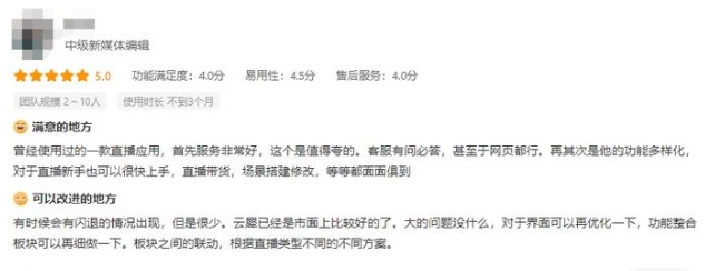 1、曾经使用过的一款直播应用,首先服务非常好,这个是值得夸的。客服有问必答,甚至于网页都行。再其次是他的功能多样化,对于直播新手也可以很快上手,直播带货,场景搭建修改,等等都面面俱到。