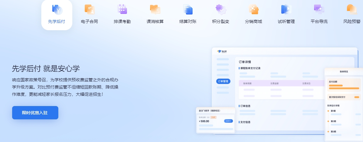 响应国家政策号召,为学校提供预收费监管之外的合规办学升级方案。对比预付费监管不但缩短回款账期、降低操作难度,更能减轻家长报名压力,大幅促进招生!