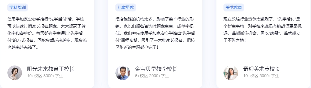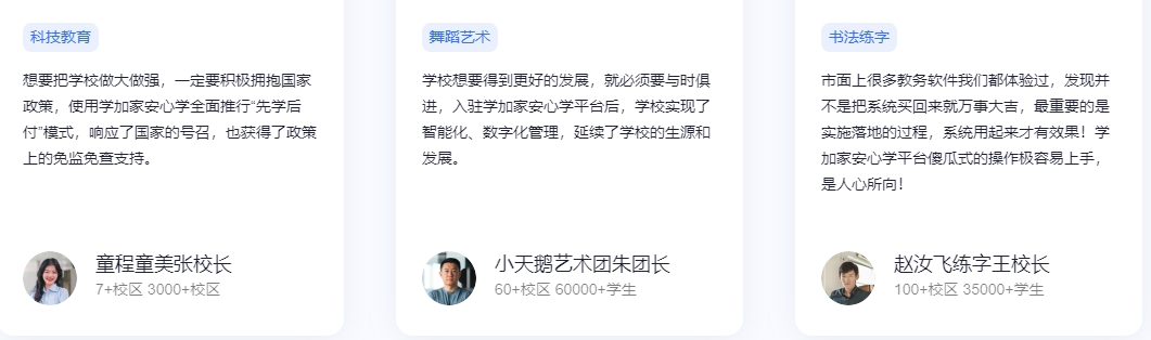 2、入驻学加家安心学平台后,以往办学过程中令人头疼的消息传递不及时、约课请假效率低、家校互动体验差等家校沟通难题都被解决了,极大地提升了学员粘性及续班率。