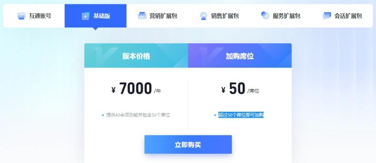基础版本价格:7000/年,提供40余项功能并包含50个席位。