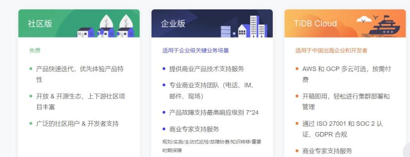 TiDB产品是根据版本来收费的,目前有社区版、企业版、TiDB Cloud三个版本,社区版是免费的,企业版、TiDB Cloud可以咨询我们的选型顾问获得具体报价。