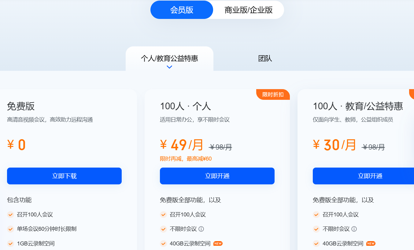 个人版既有免费版本,也可以付费升级为会员;会议需求在100人及以内的个人会员收费标准为:49元/月;会议需求在100人及以内的教育公益会员收费标准为:30元/月。