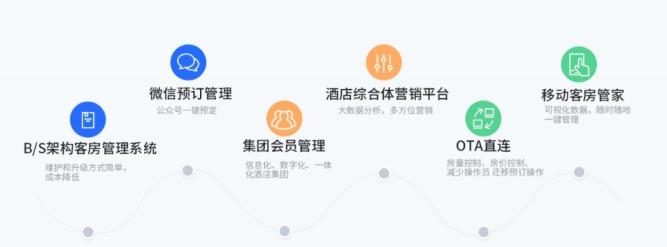 手机PMS、微信订房管理、 客户关系管理、客房管理手机应急、前台收银管理、财务应收管理、会员管理预定管理、支付接口、OTA接口、小仓管管理、中央预定会议室管理