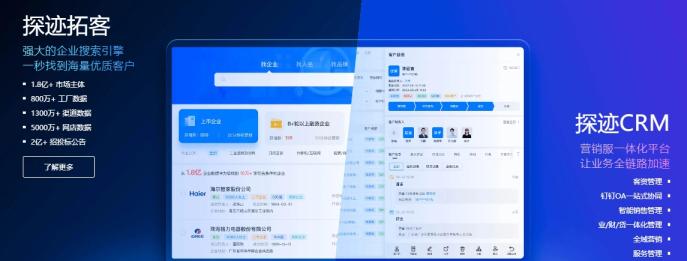 探迹科技基于1.8亿+市场主体的全量知识图谱,结合NLP、机器学习算法等人工智能技术,构建了全球领先的AI和大数据智能销售SaaS平台,为企业提供从线索挖掘、商机触达、客户管理到成单分析的全流程智能销售服务,帮助企业高效获取精准销售线索,降低获客成本,从而全面提升销售效率和业绩,而且探迹拓客还可以免费试用功能,在服务方面的体验感还是不错的,至于好不好用,还是需要自己体验过才知道。