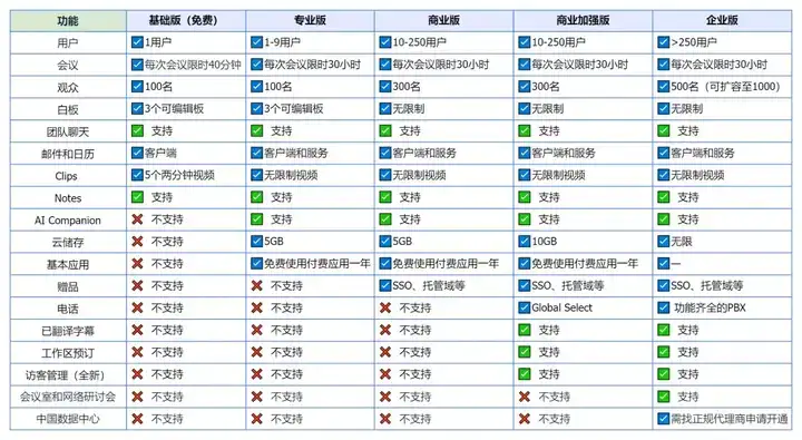 会议(单次30小时)、300名观众(可扩容)、含专业版功能、白板、云存储5GB,支持Clips无限制视频、Notes和AI Companion、SSO、托管域等,有专属售后群。