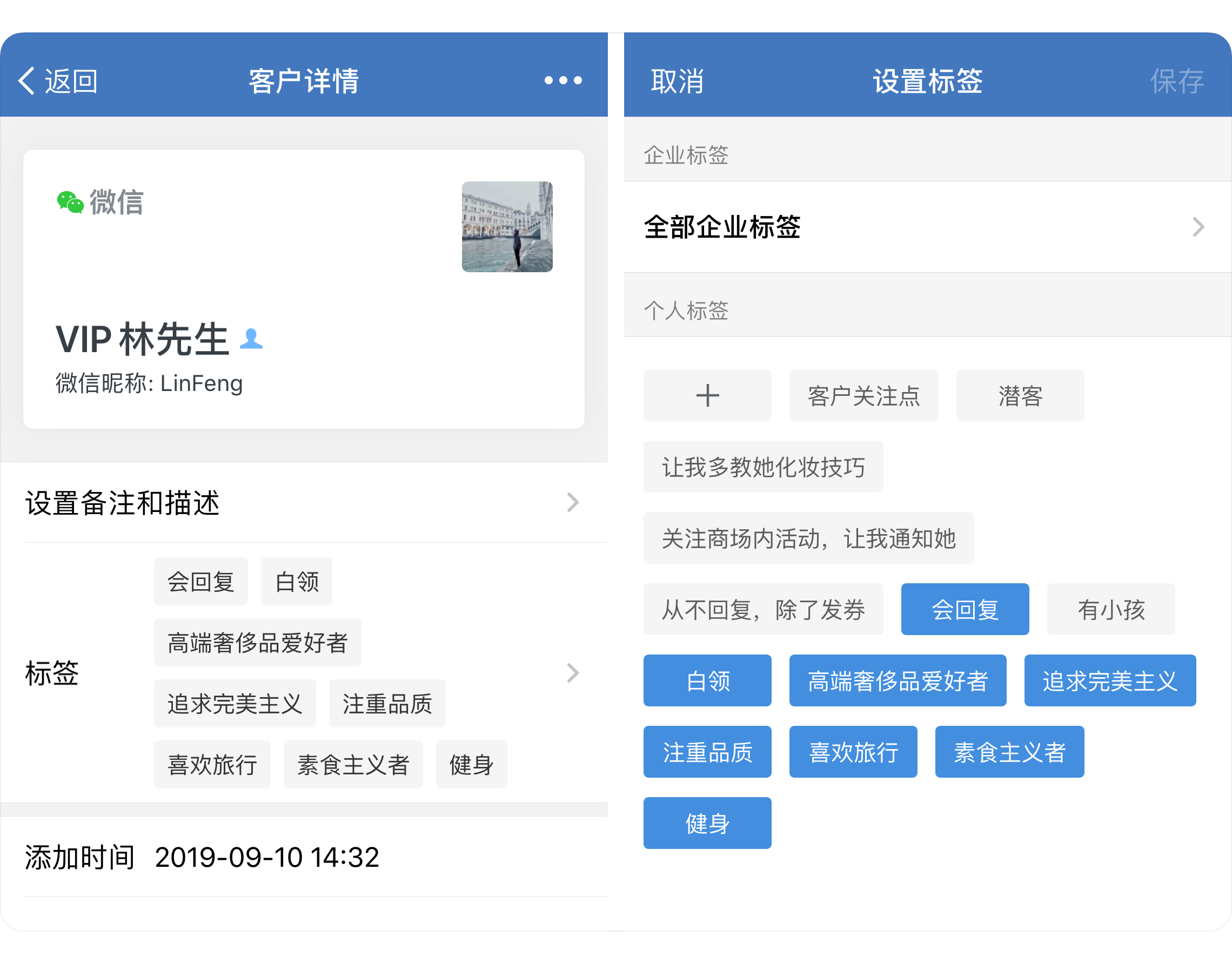 例如:通过企业微信的标签分类管理顾客,了解每一位顾客的特点和偏好,不见面也能拉近与消费者的关系,让顾客感觉“被重视”,服务体验更好。还能批量服务同一标签的顾客,四两拨千斤。