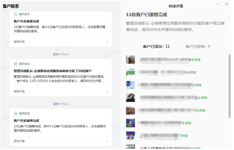 最重要的是,企业需要把顾客留在自己手中,才能提供持续稳定的服务。员工用企业微信加顾客微信,一旦员工离职,企业可以把他添加的顾客分配给其他员工继续服务,对企业来说,留住来之不易的顾客;对顾客来说,服务不中断,一直很贴心。