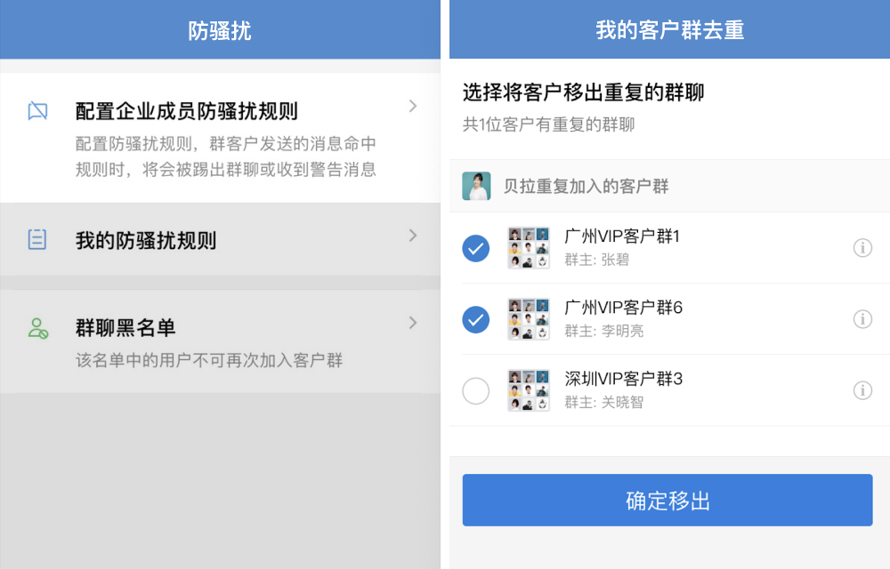 企业可以检测不同的客户群中重复的客户,可以将重复的客户从指定的群聊中移出。